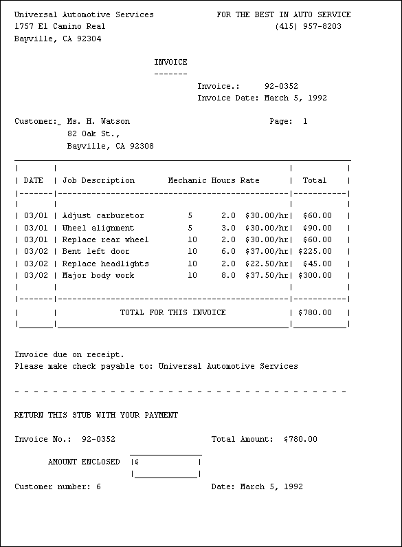 These records are then used to generate customer invoices, weekly time sheets for employees, and reports on the kinds of jobs the garage has been handling.