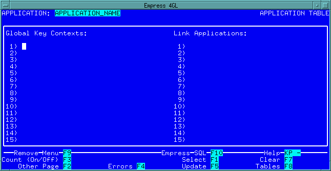| Key Label | this must be a label that is mapped to a physical key on the terminal where the application is to run. The mapping of names to keys is defined in the Empress 4GL system tables described in the Terminals appendix. In the terminal configurations supplied with Empress 4GL, the names AP_1 to AP_10 are always mapped to physical keys and are available for use. If you have not re-configured your terminal, you can use these names. If you have done your own terminal configuration, then you should look in the system tables to find out the names you should use. |