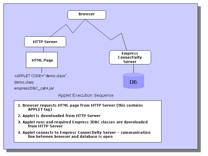 This document explains the specifics of Empress drivers, and the architecture of the Empress JDBC scenarios.The basic scenarios are shown below: