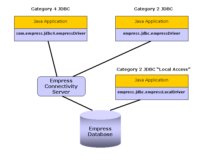 Category 2 and Category 4 Drivers are both used in the two tier system directly accessing the Empress Connectivity Server. Category 4 Driver is a pure java implementation and does not require any shared libaries whereas Category 2 Driver does.