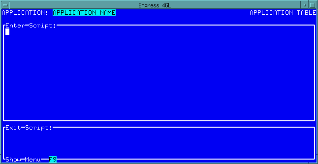 | Enter Script | An area in which you may write the enter script for the application. This area will scroll when you reach the bottom of the box. To scroll back use the keys as described for Empress 4GL's Field Editor. |