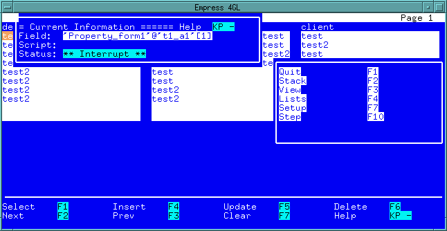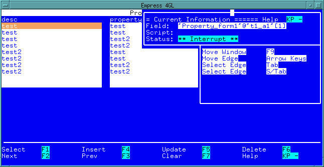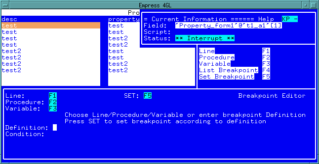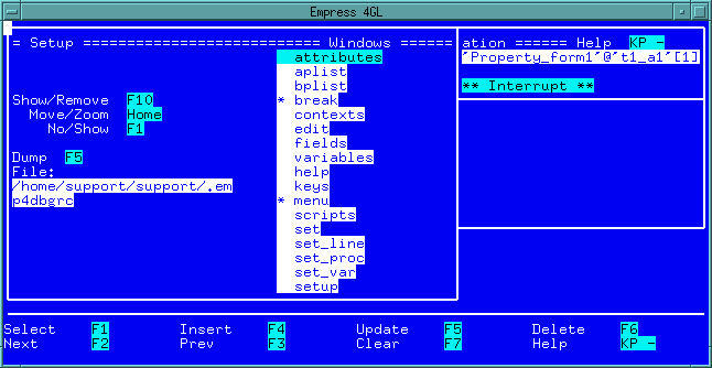 The value of the highlighted variable can be edited using the Edit function. This will place the value of the variable in a small window where it can be edited using the normal Empress 4GL editing functions. Once the value is changed the normal Quit function will update the variable. This can be used to determine how an application will react to certain values or to bypass an error caused by an incorrect value.