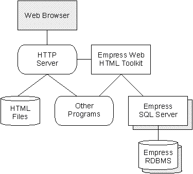 The Empress Web HTML Toolkit (Toolkit) uses the Empress Connectivity Server to connect to databases, and the Common Gateway Interface (CGI) to connect to Hypertext Transfer Protocol (HTTP) servers. The HTTP Servers can in turn connect to HTML/XML browsers, either on the local host, across a LAN or across the Internet. The Toolkit can issue SQL statements to fetch and update data, and can call and run any other executables.