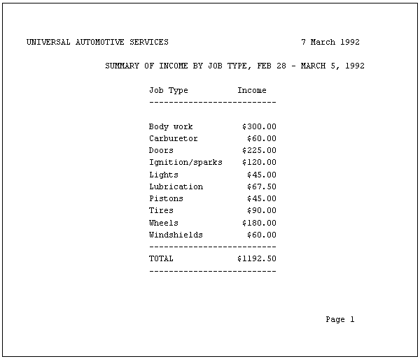 The simplest report lists the different repair job classifications, sorted alphabetically, and the codes used for each classification. This report is normally thumbtacked above the mechanics' terminal, and the employees read the job code from it for entering into the hours table. The report takes information from the rates table, sorts it, and prints it out centered in the page.