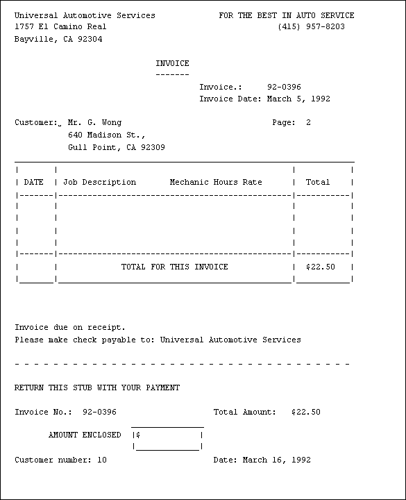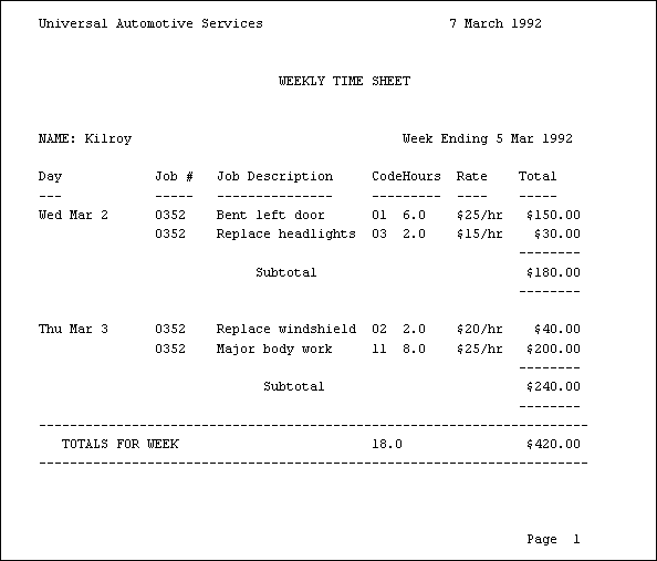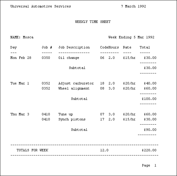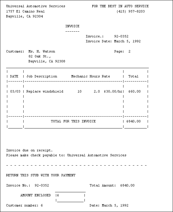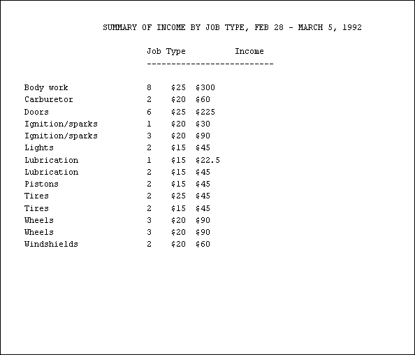 These records are then used to generate customer invoices, weekly time sheets for employees, and reports on the kinds of jobs the garage has been handling.