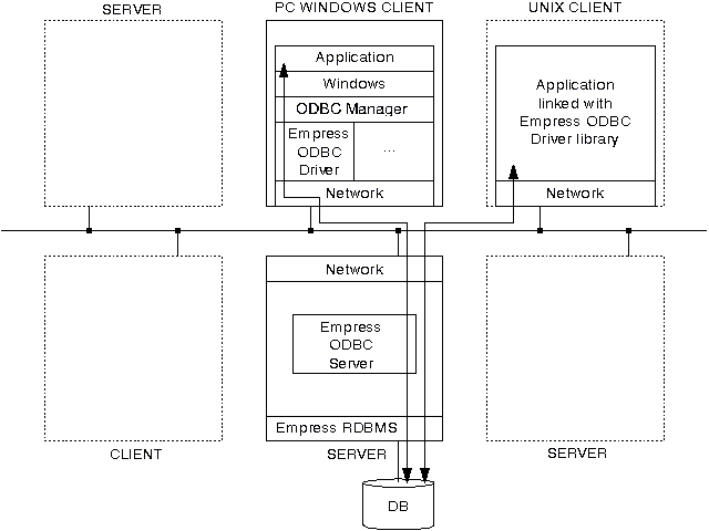 Empress コネクティビティ (ODBC)はEmpress RDBMSに ODBC サービス インターフェイスを 提供するスタンバイ ネットワーク サーバーです。 ODBCクライアントは ネットワーク上の接続を確立するためにコネクティビティ(ODBC)に対して 「ODBC接続呼び出し」をおこないます。